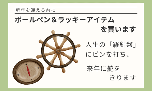 タイミングには意味があります ラッキーアイテムとボールペンには、“買うタイミング” にそれぞれ理由があります。 来年のテーマに合わせて、そのタイミングも大切にしてほしいのです。 ラッキーアイテムは「なるべく早く」 来年の...